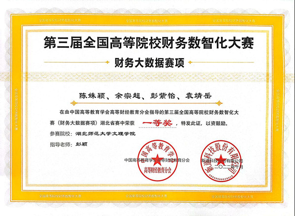 本网讯(通讯员 渣梦丽)10月8日,2022年湖北省第三届全国高等院校财务数智化大赛圆满落幕,米兰体育(中国)官方在线登录经济与管理学部财务管理专业由陈姝颖、余宗超、彭紫怡、袁靖岳同学组成的团队获得一等奖,指导教师为彭颖。由邵雅琦、周梦婷、黄羽轩、董婷同学组成的团队在袁家健老师的指导下获得三等奖。