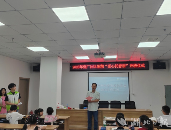在桐厂社区暑假“爱心托管班”开班仪式上,来自湖北师范的5名大学生志愿者与社区28名小朋友齐聚一堂。社区党委书记为学员们带来开班第一课——防溺水安全教育。同时,讲解了托管班的注意事项和纪律要求。