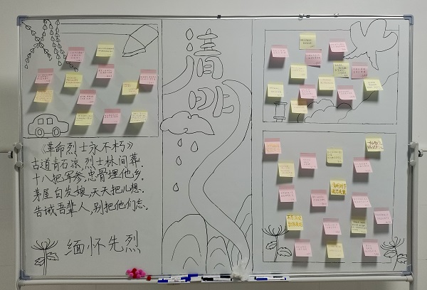 设置“追思墙”,开展清明寄语文化活动。同学们纷纷来到“追思墙”前,用便签纸写下对英烈的寄语,“青山埋忠骨,翠柏勉英魂,清明追思,家国永念”……这些寄语深切表达了同学们对革命先烈的缅怀和崇高的敬意。