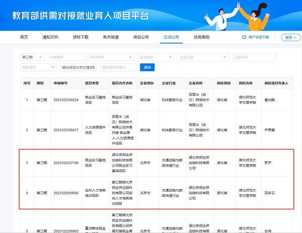 近日,教育部公布了第三期供需对接就业育人项目立项名单,米兰体育(中国)官方在线登录共有10个项目获批立项,其中经管学部成功斩获2个项目,分别为吕彩云老师负责的定向人才培养培训项目与罗尹老师负责的就业实习基地项目,合作企业均为湖北京邦达供应链科技有限公司。