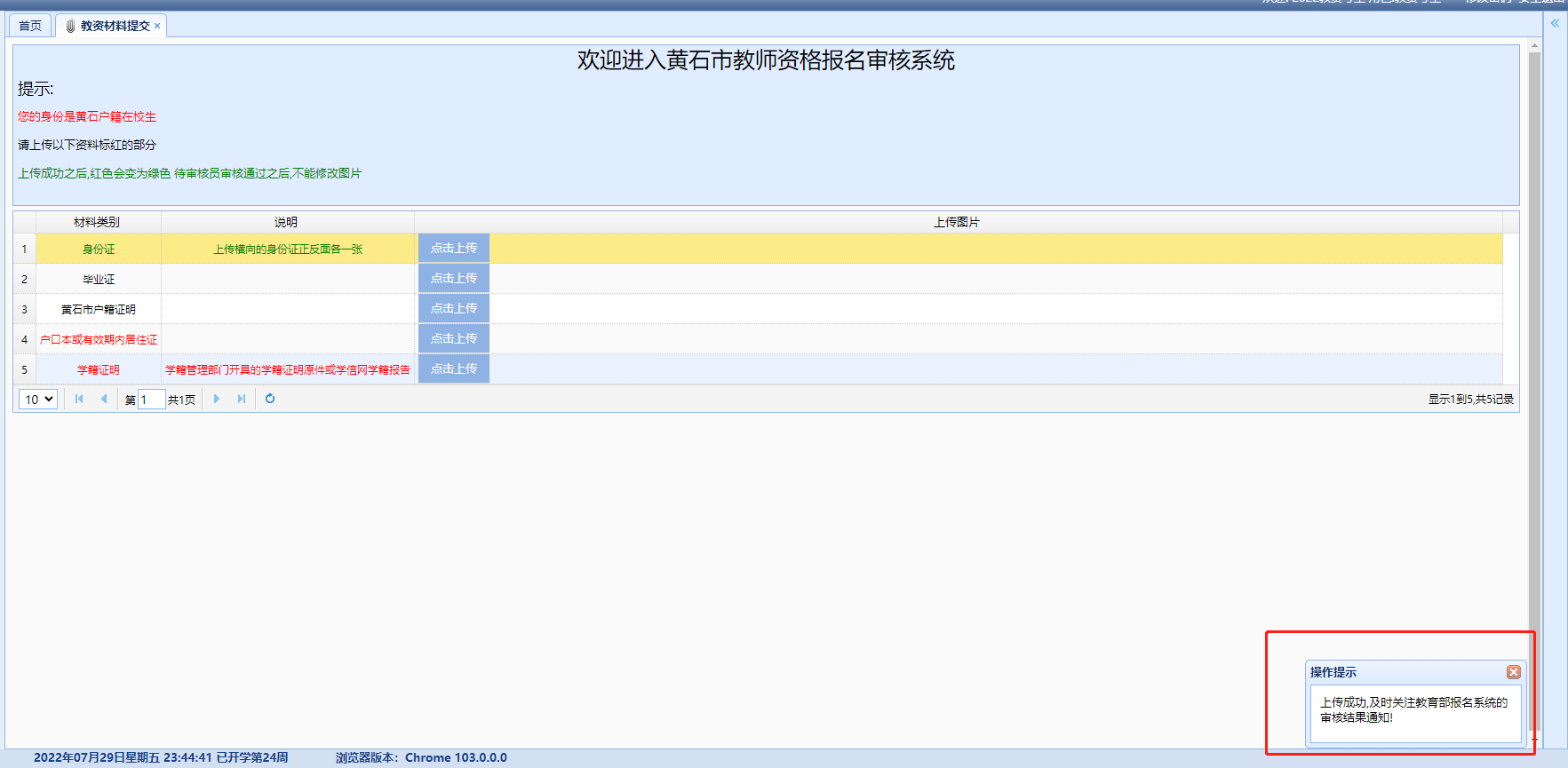 上传成功之后,红色的材料文字介绍会变为绿色。