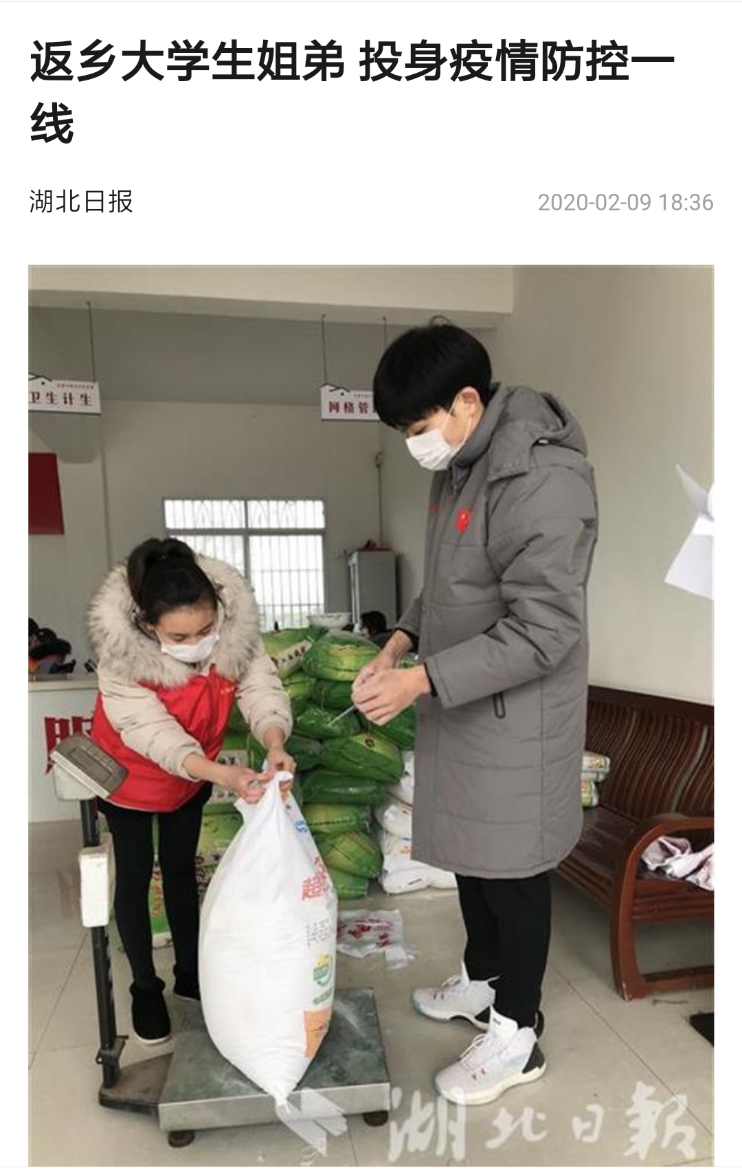 2020年2月9日,湖北日报上有一篇关于疫情防控的新闻引起广泛关注,主人翁正是米兰体育网页版理工学部数学与应用数学专业1603班的吕奎同学和其弟弟吕东阳。据报道,2020年2月7日,姐弟俩从村微信群里看到“志愿者征集令”后,2月8日一大早便到三州村委会报到,参与对村民生活必需品的分装与发放。图片中是2月8日当天,他们在枝江市百里洲镇三洲村防疫物资分配现场填写订购物资的订购居民的姓名并给居民分配物资时的情景。姐弟俩一个牵着口袋,一个则对袋中面粉进行分装。分装完面粉后,又开始为居家隔离的村民分装集中采购的大米、面条和新鲜的蔬菜并贴上标签,以备村组干部精准送达村民家中。