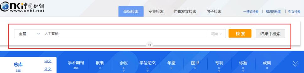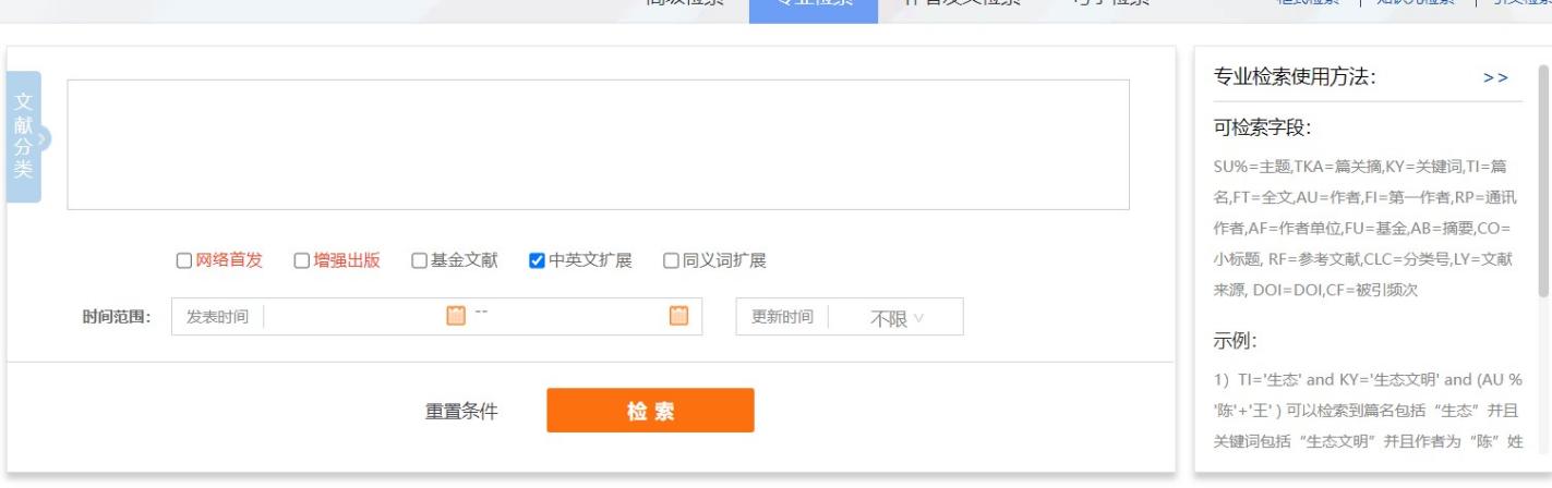 鼠标移入页头“检索”,可选一框式检索、高级检索、专业检索、作者发文检索或句子检索,点击进入相对应检索页面。
