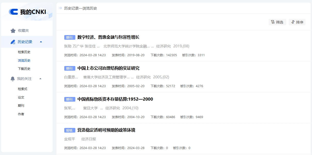 浏览历史为浏览文献知网节的记录,显示浏览过的文献类型、题名、作者、机构、来源、浏览时间等信息,支持按浏览时间筛选或排序。点击文献标题,跳转至该文献知网节页面。鼠标悬停到某篇文献,点击按钮可下载或收藏该篇文献。