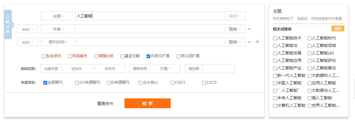 主题检索是以知网标引的主题(机标关键词)为核心检索内容,同时涵盖所有内容相关字段,在检索过程中嵌入了专业词典、主题词表、中英对照词典、停用词表等工具,并采用关键词截断算法,将低相关或微相关文献进行截断。主题检索旨在提供一种能够涵盖文章所有主题特征并综合时间特征的检索手段,适用普通用户快速查询和调研。