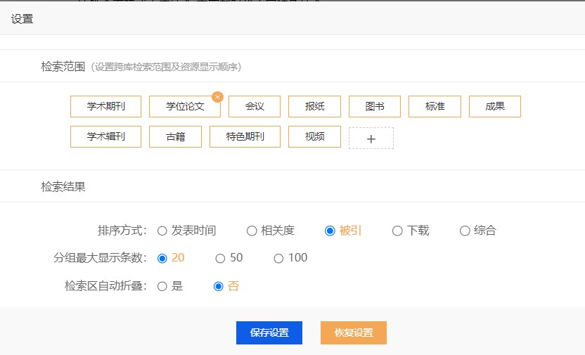 (2)在一框式检索或高级检索页面中的检索设置里删除或添加资源类型
