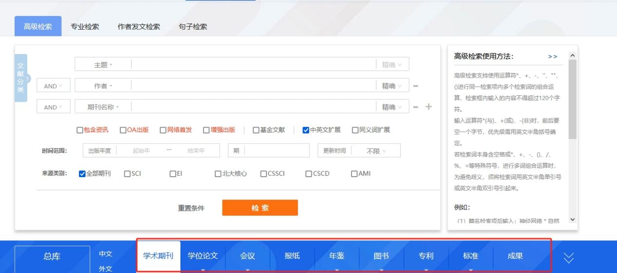 (3)在首页点击“高级检索”,在高级检索页面下方切换数据库进入单库高级检索。
