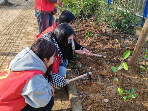纵使天气寒冷,志愿者们内心却依旧炙热。在陈小龙书记带领下,志愿者们条理清晰、分工明确,有的负责用锄头锄地挖坑,有的则负责栽种树苗。志愿者们齐心协力,共同为春天种下希望。阳光灿烂,微风习习。一锹土,种下的不仅是树苗,也是保护生态环境的决心;一桶水,浇灌的不仅是土壤,也是建设美丽中国的梦想。志愿者们积极参与到生态文明的建设中,争做绿色发展理念的传播者。