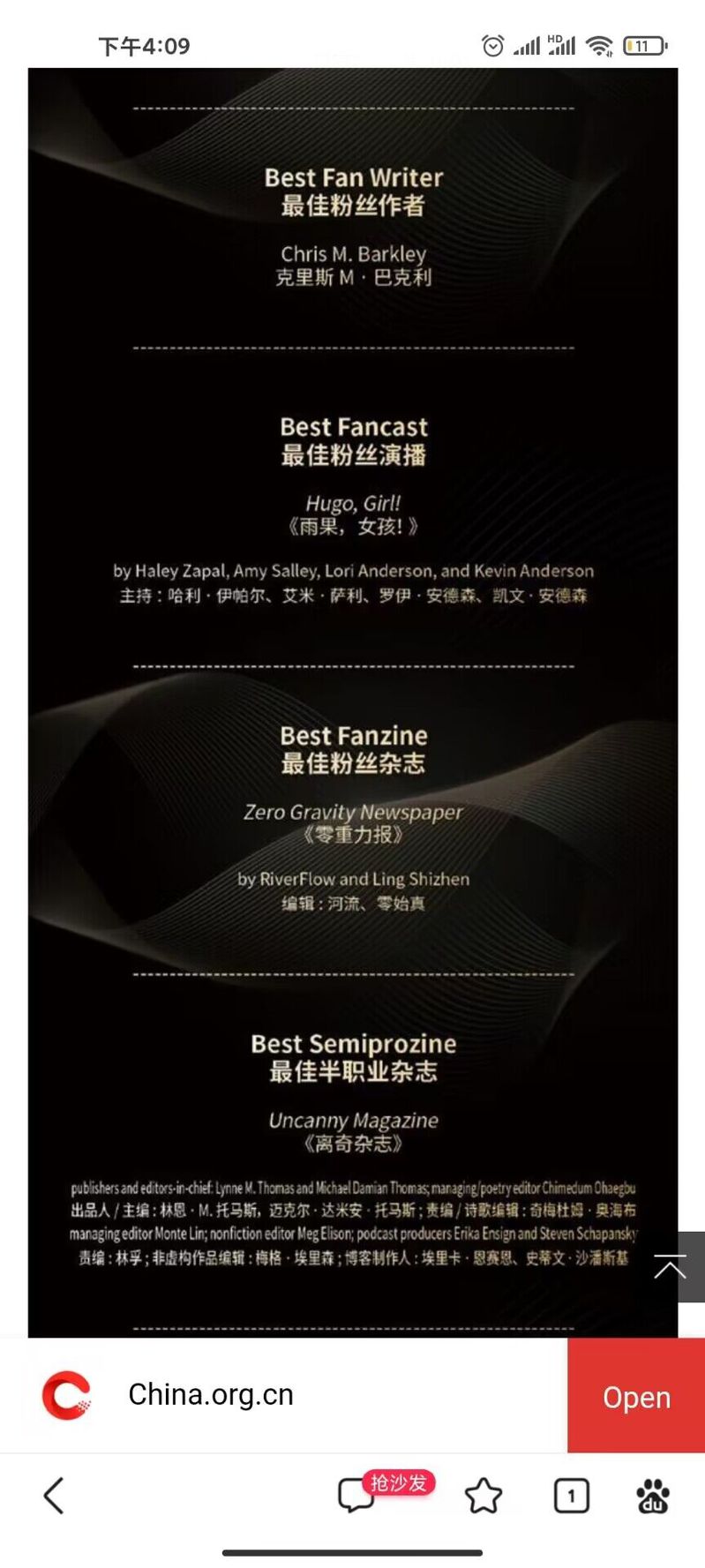 2023年第81届世界科幻大会于10月18日至22日在成都科学馆举行,世界科幻大会由世界科幻协会主办,是全球最受瞩目、历史最悠久、规模和影响力最大的科幻文化主题活动,2023年首次在中国举办。此次大会评选出17个雨果奖奖项和惊奇奖、北极星奖等荣誉,米兰体育(中国)官方在线登录人文学部中文专业2205班学生温卓峰主编的科幻杂志《零重力报》获得“最佳粉丝杂志”的荣誉称号,《人民日报》、中国网、央视网等多家媒体杂志都进行相应报道。http://m.app.china.com.cn/english/template/displayTemplate/news/newsDetail/9000050/116765845.html?isShare=true