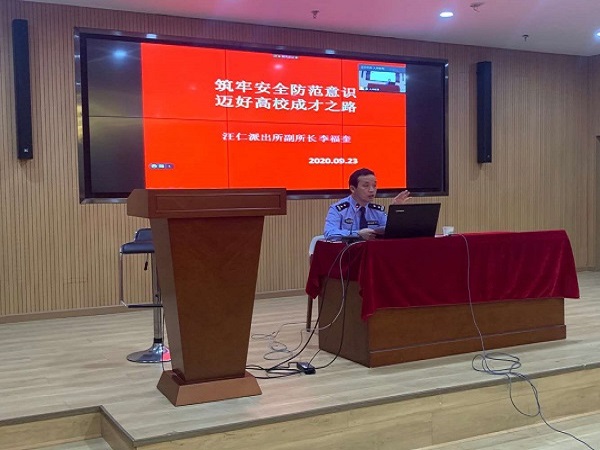 9月23日下午,汪仁镇派出所副所长李福奎一行3人来到米兰体育(中国)官方在线登录,开展法治教育进校园活动。活动采取网络授课的形式进行,在信息中心报告厅设主会场,在各学部教室设分会场,2020级1300余名本科新生参加了听课。