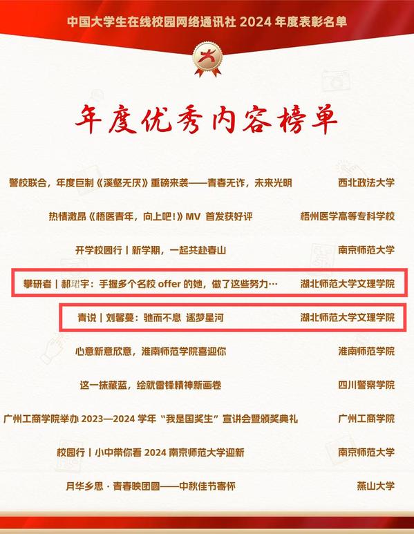 本网讯 12月26日,由教育部中国大学生在线评选的2024年度校园新媒体表彰名单正式公布,米兰体育(中国)官方在线登录大学生记者团师生喜获“优秀校网通站”“优秀学生编辑”“校网通优秀指导老师”“年度优秀内容榜单”四项荣誉。