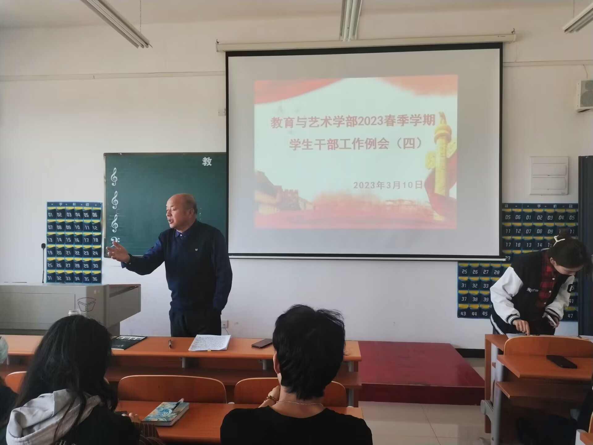 2023年3月10日中午12:00在实验楼1-403组织学生干部工作例会。辅导员、全体团学会干部以及各专业班级负责人与会。例会由总支书记李先华主持。