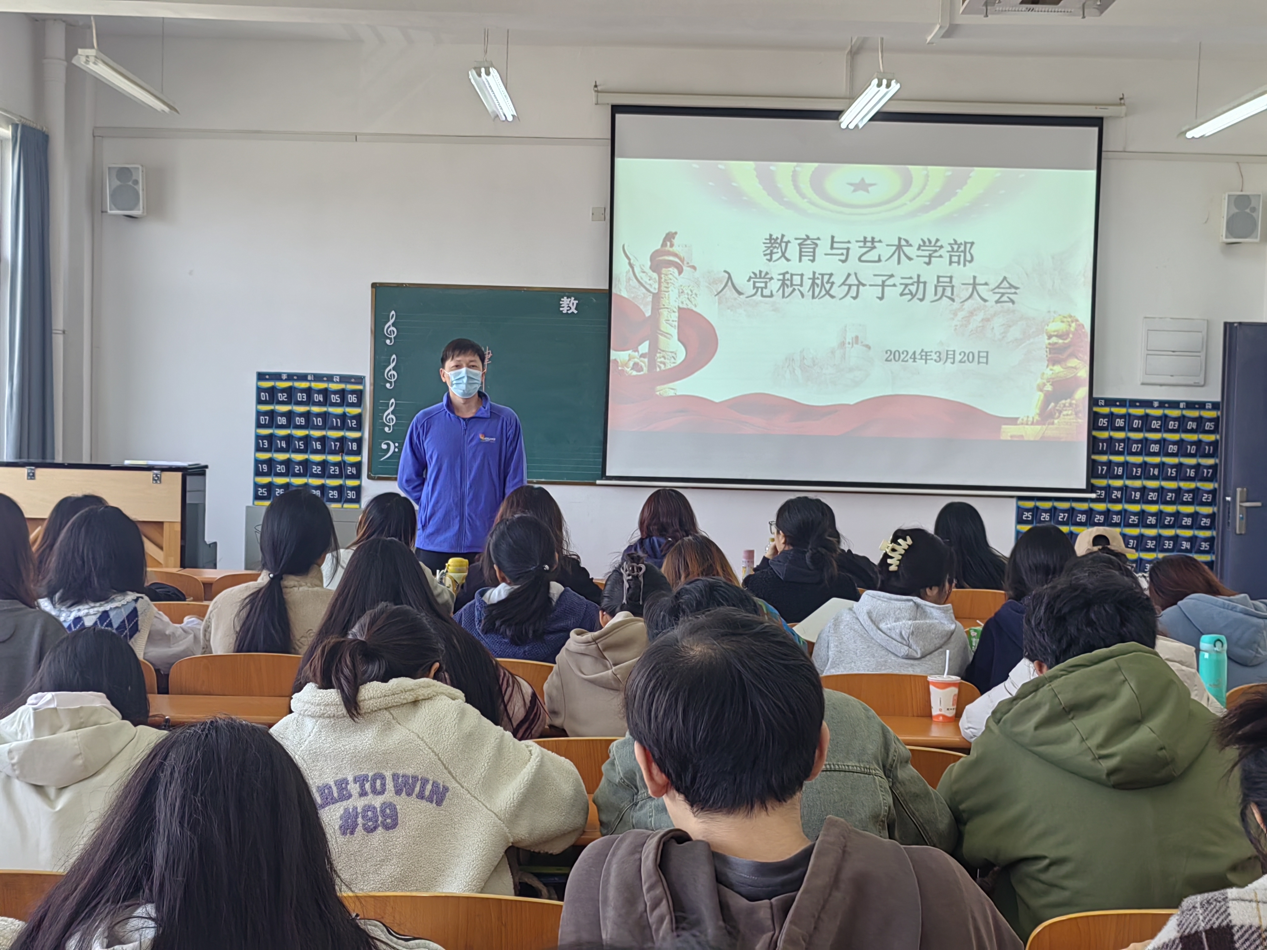为进一步坚定入党积极分子的理想信念,增强党性修养,提升党组织的凝聚力和战斗力,教育与艺术学部于2024年3月20在1-403进行第33期入党积极分子动员大会。教艺学部党总支书记李先华、学工办副主任尹誉霖应邀参加了动员大会。
