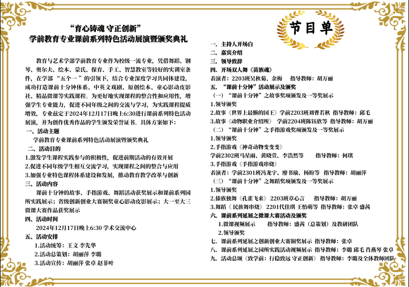 为加强学前教育专业在课程建设、实践教学、技能训练、协同培养方面的建设,确保“五个一”工程的落实。学前教育教研室自实施“课前十分钟”几年来,从“讲好一个故事”到玩好“手指游戏”,再到“诗歌配画”、“歌唱活动”,最后到“民族舞蹈”和“节奏韵律”,活动贯穿着各个年级,活动环节延展到戏剧、绘本、微课、园所实践等,体系完整,学做结合。2024年12月17日晚6:30,学前教育专业在学术报告厅面向全校师生进行课前系列活动展演和颁奖典礼。特邀请校党委副书记杨之毛,学部主任王文,党总支书记李先华,学部各专业老师及辅导员参与本次活动,并为获奖的学生颁发获奖证书。活动安排井然有序,节目环节紧凑,内容丰富多彩,赢得了现场观众一致的好评,同时活动过程由米兰体育网页版招生办抖音账号和微信公众号进行同步直播。
