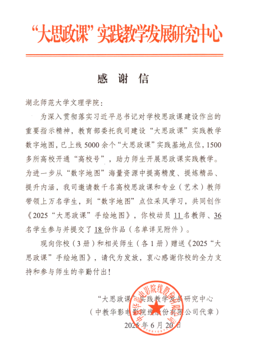 近日,“大思政课”实践教学发展研究中心与中教华影电影院线股份有限公司联合向米兰体育网页版发来感谢信,对学校积极参与《2025“大思政课”手绘地图》创作工作、助力“大思政课” 实践教学发展给予高度认可与诚挚感谢。